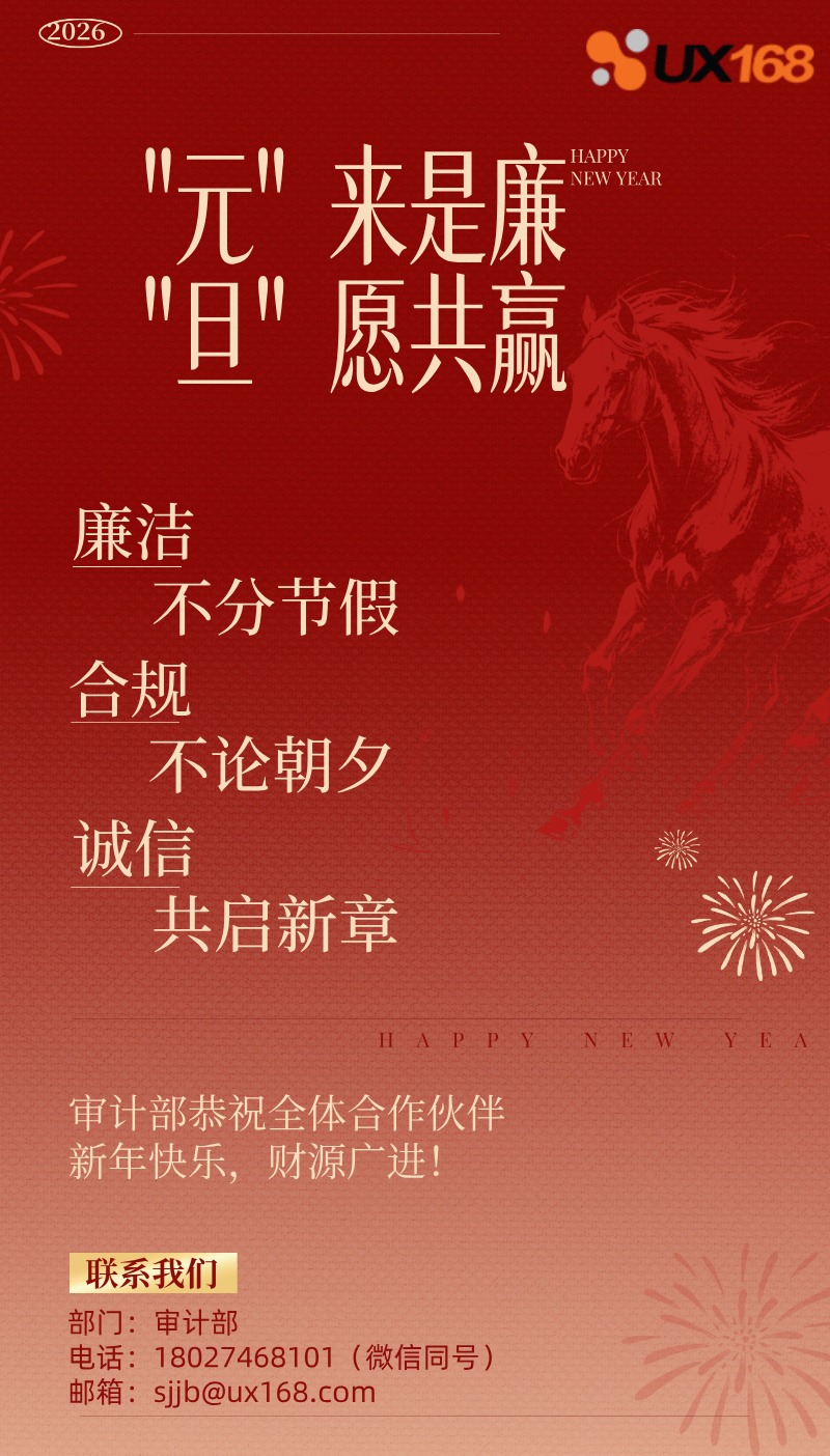UX公司审计部谨向长期以来携手同行的各位供应商伙伴,致以最诚挚的新年祝福!感谢您始终坚守诚信底线、践行合规合作!