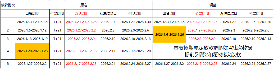 春节期间,为避免您无法收款,特调整为提前放款。同时,春节期间,您仍可正常请款,财务会按正常周期进行付款。
