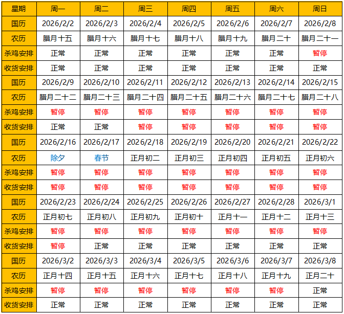 ②节前最后收货时间:2026年2月10日(含),当日18:00后将不再接收各类货物。