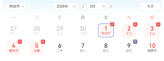 放假:2026年5月1日(星期五)- 5月5日(星期二),共5天;